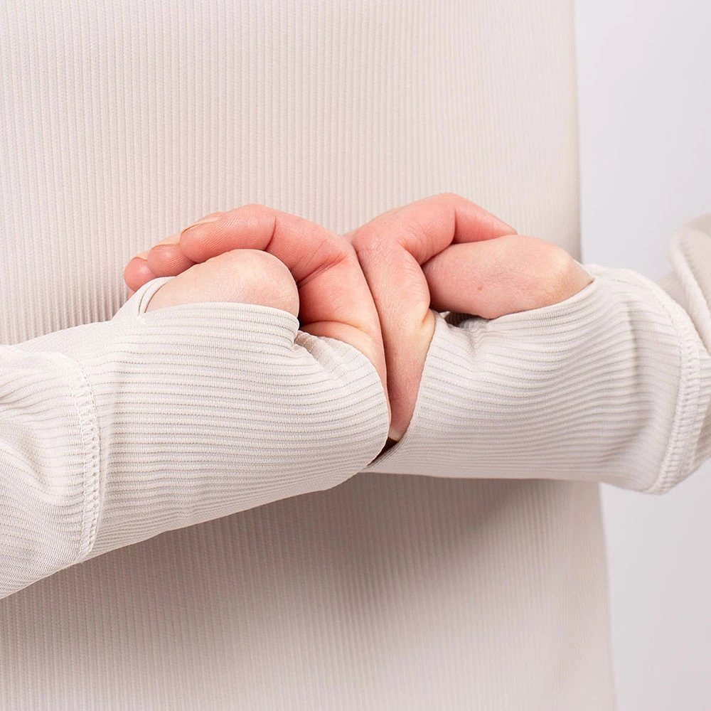 - doppellagige, anliegende Ärmelbündchen mit Daumenloch